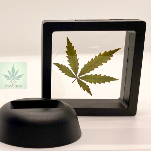 757 Cannagifts Small Genuine Pressed Cannabis Leaf #2 in Floating Plastic Display (Black)